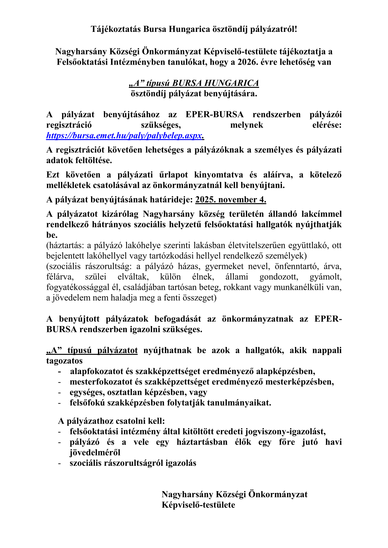 Nagyharsány Községi Önkormányzat Képviselő-testülete tájékoztatja a Felsőoktatási Intézményben tanulókat, hogy a 2026. évre lehetőség van