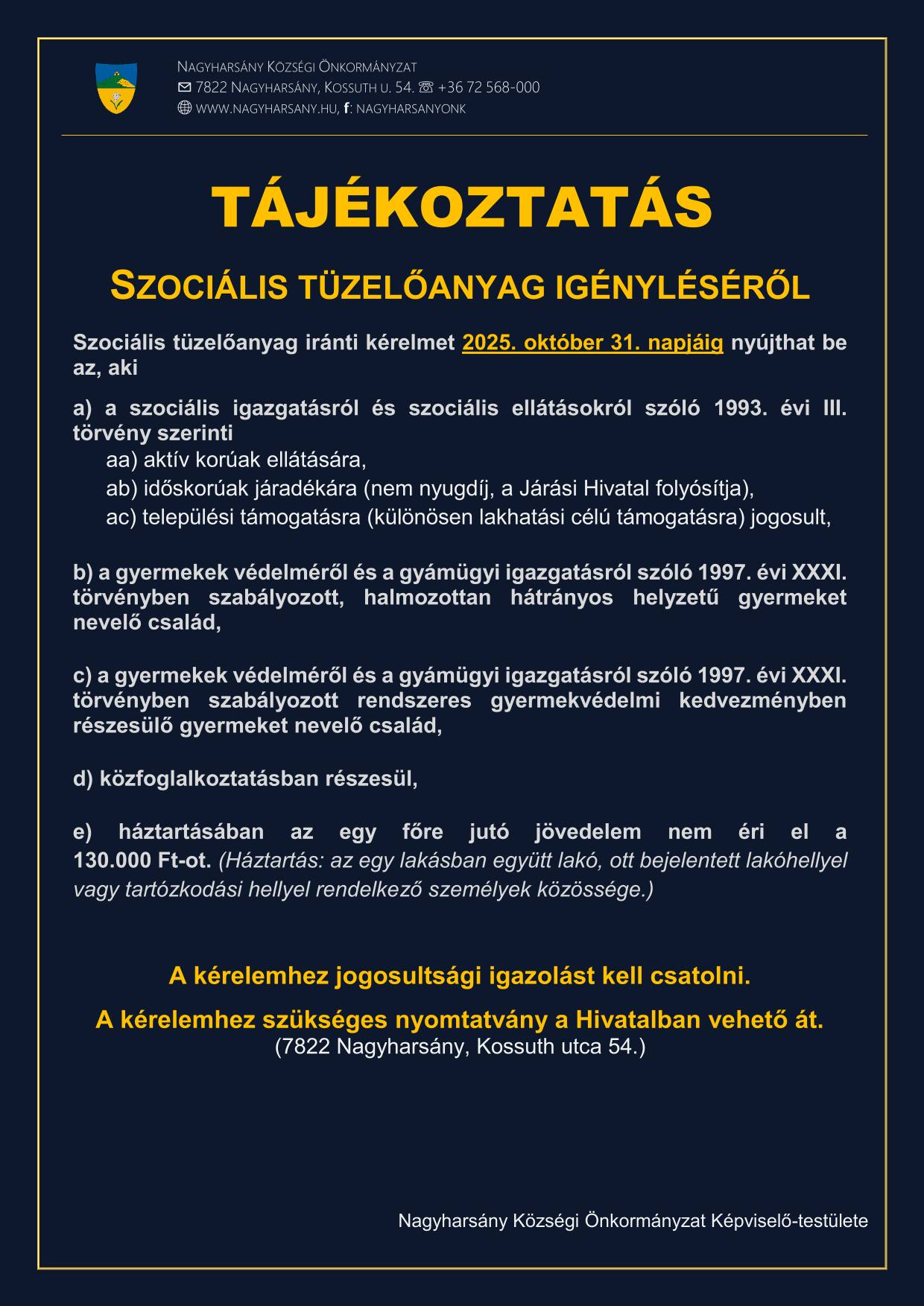 TÁJÉKOZTATÁS – Szociális tüzelőanyag igényléséről